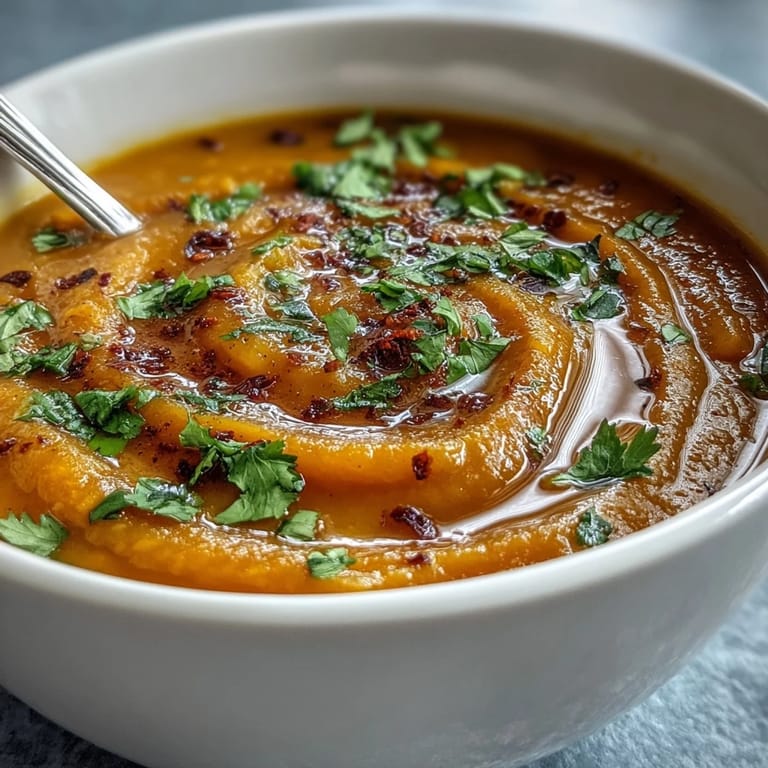 Pin it There's a moment, right after you blend this soup, where it transforms from a pot of ingredients into something that looks and feels completely different. The color shifts to this deep, warm orange, and the steam rising from it carries the full aroma of everything you've built. That moment still gets me every time I make it.