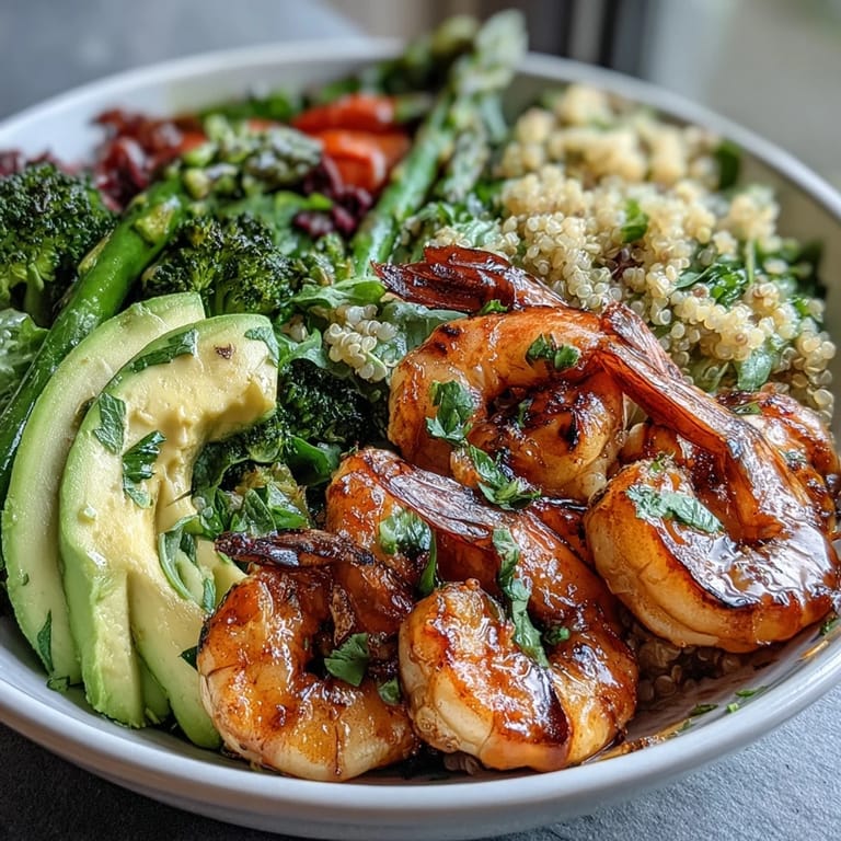 Pin it I stumbled onto this bowl on a Tuesday afternoon when my fridge felt simultaneously packed and empty—you know that feeling? There were vibrant vegetables waiting to be used, some shrimp I'd grabbed on impulse, and a half-finished bag of quinoa taking up shelf space. Instead of my usual rotation, I decided to build something that felt intentional, something that didn't require heating up my whole kitchen. Twenty minutes later, I was staring at this gorgeous arrangement of colors and textures, realizing I'd accidentally created exactly what I'd been craving without quite knowing it.