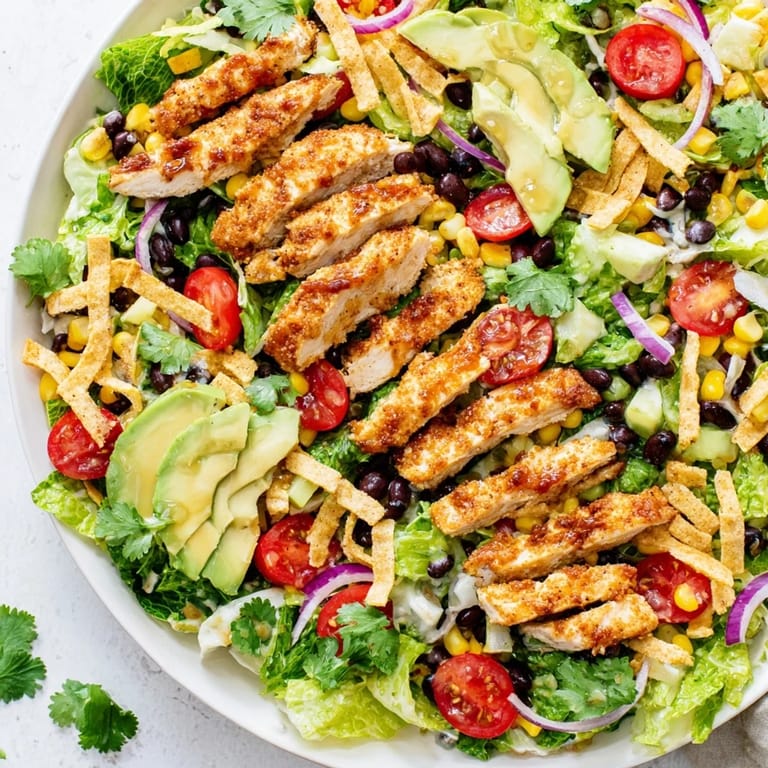 - Drizzle dressing over the salad and toss gently to coat. Top with sliced chicken, tortilla strips, and fresh cilantro, then serve immediately while everything is crisp.