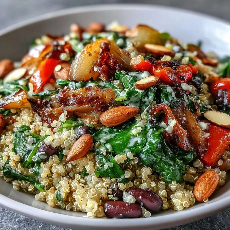 Pin it This Veggie and Quinoa Power Bowl celebrates nourishment in its most vibrant form. Each colorful component brings not just visual appeal but a unique nutritional benefit to your table. The fluffy quinoa forms a protein-rich base while the rainbow of roasted vegetables adds depth and sweetness. The earthy beans provide substance, and the nuts offer a satisfying crunch that ties everything together.